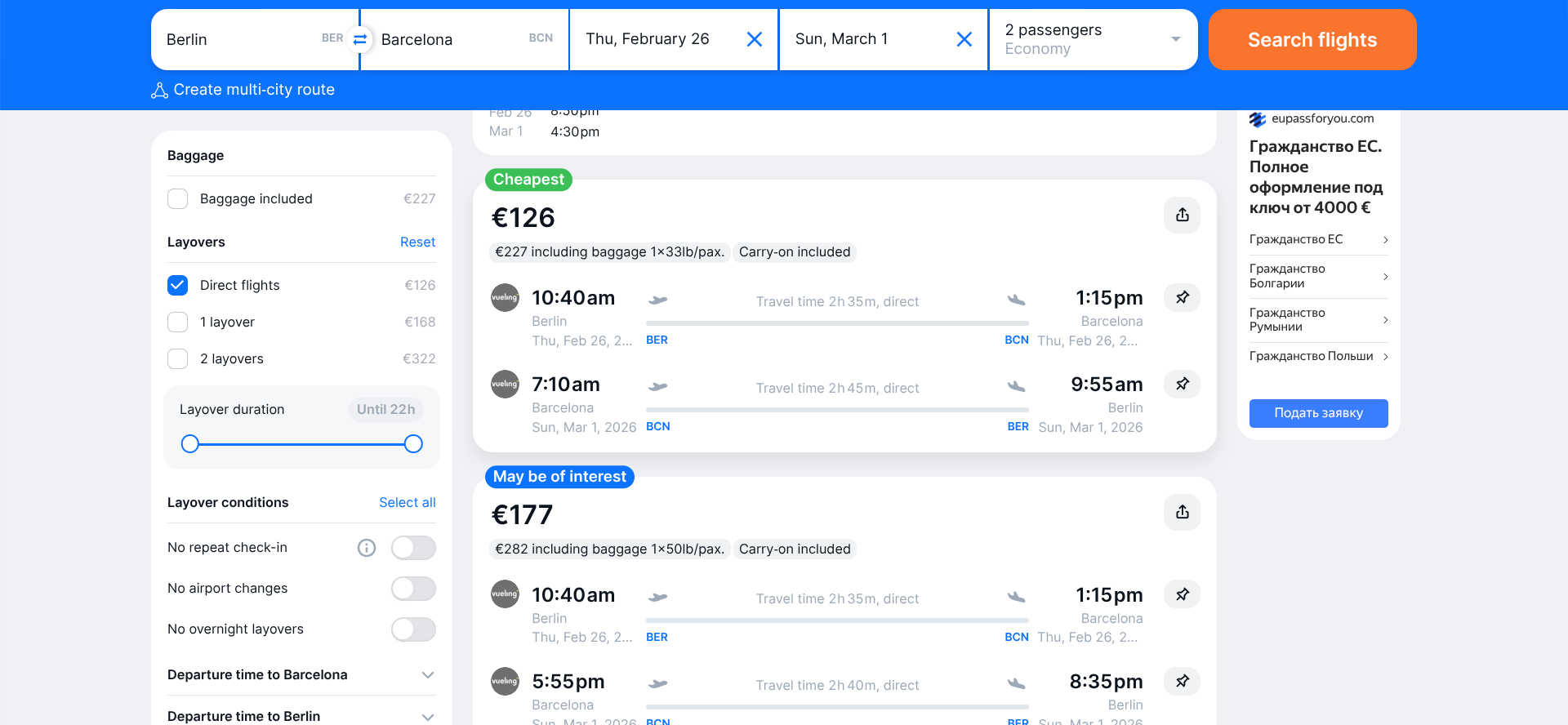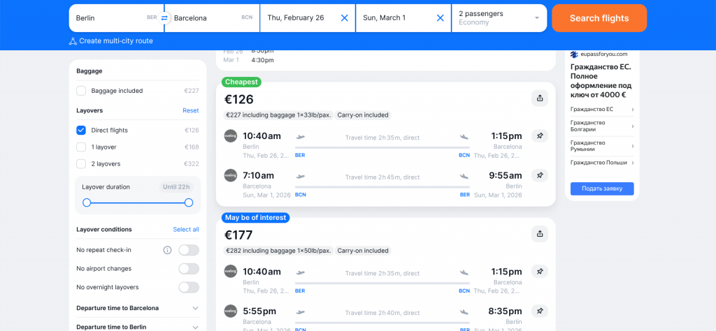 Fliegen Sie ab 63 € p.P. von Berlin (BER) nach Barcelona (BCN). Dieser Preis gilt für den Flug am 26.02.2026 um 10:20 Uhr.