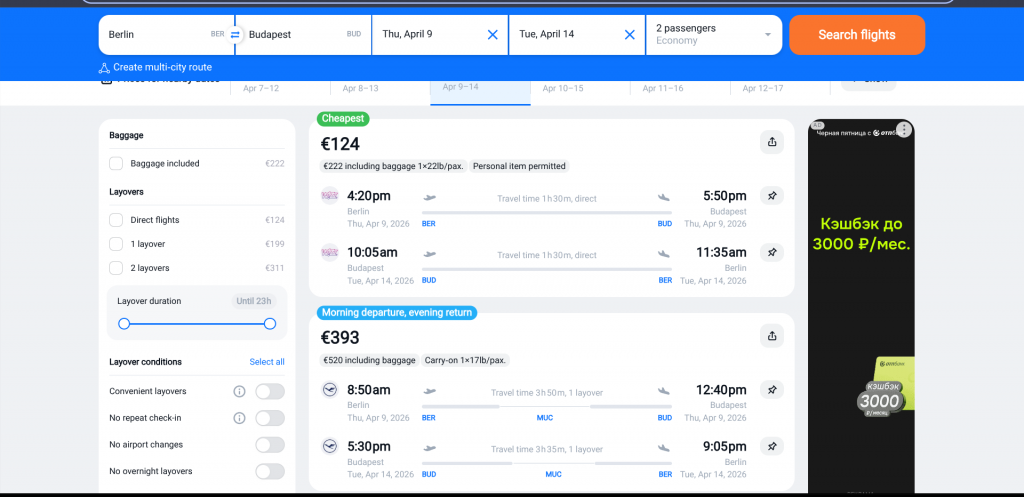 Fliegen Sie ab 62 € p.P. von Berlin (BER) nach Budapest (BUD). Dieser Preis gilt für den Flug am 09.04.2026 um 16:20 Uhr.