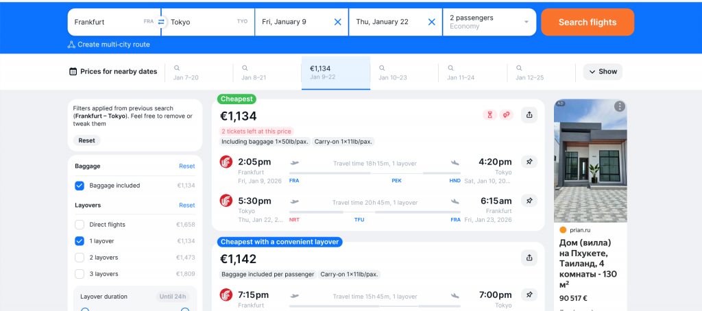 Fliegen Sie ab 567 € p.P. von Frankfurt (FRA) nach Tokio (TYO). Dieser Preis gilt für den Flug am 09.01.2026 um 14:05 Uhr.