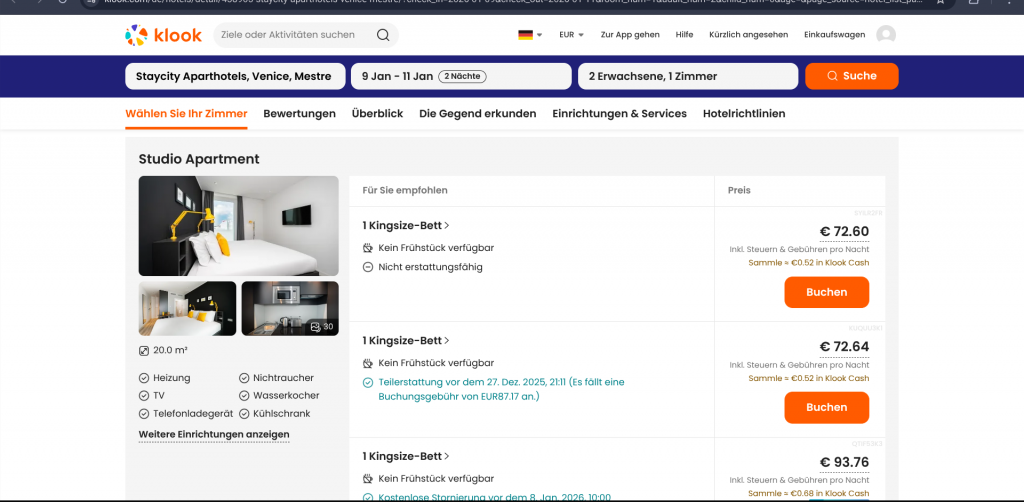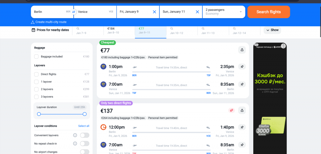 Fliegen Sie ab 38 € p.P. von Berlin (BER) nach Venedig (VCE). Dieser Preis gilt für den Flug am .09.01.2026 um 13:00 Uhr.